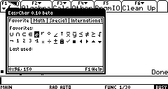 | This is a TSR Event Hook, which replaces the boring AMS char menu. It hookes the hot key [2nd]+[+], and displays instead of the normal char menu a better graphical interface with more features. | |||